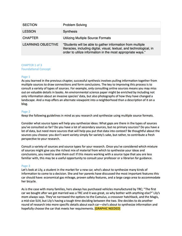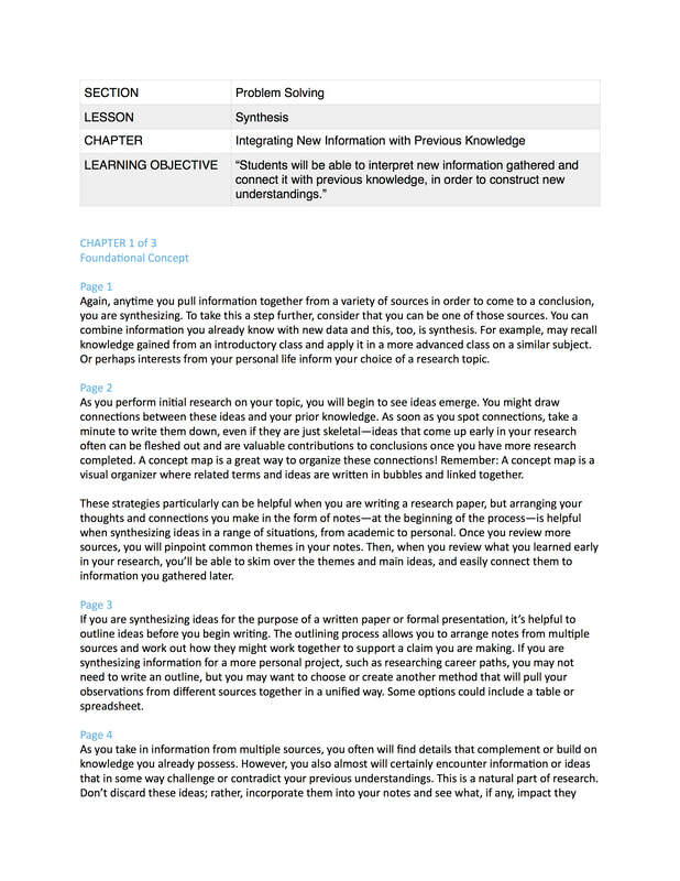 Raw text. Researched and wrote lesson about synthesis to be included in a college-level course teaching critical thinking and information literacy skills.