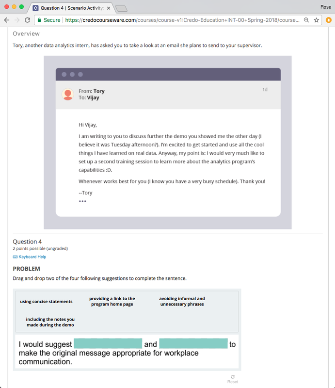 Built drag-and-drop problems to follow scenarios about professional conduct.