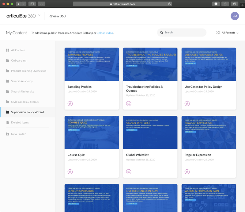 Course of 16 modules I wrote, narrated, and produced to train current employees and customers on policy creation. Culminates in a robust Course Quiz that includes a detailed interactive simulation in which users must correctly follow prompts in order to receive a passing score.